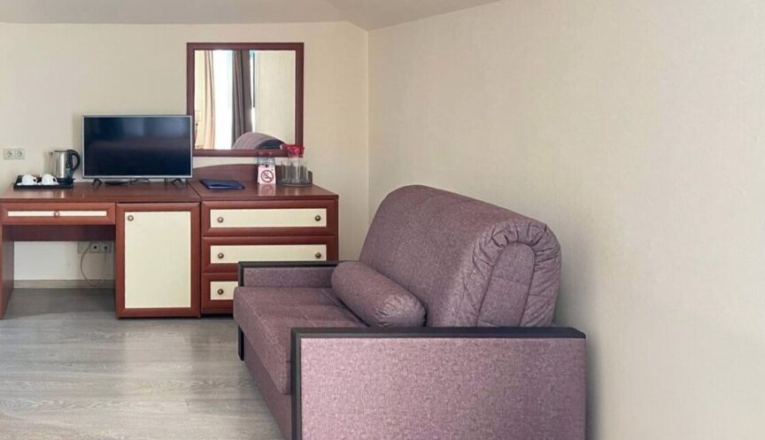 Двухместный однокомнатный номер с двуспальной кроватью и балконом, санузел с ванной, телевизор, холодильник, телефон, система охлаждения в летний период, фен, халаты, тапочки.